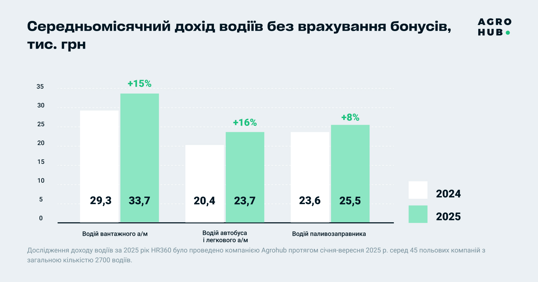 Дослідження доходу водіїв за 2025 рік HR360 було проведено компанією Agrohub протягом січня-вересня 2025 р. серед 45 польових компаній з загальною кількістю 2700 водіїв.