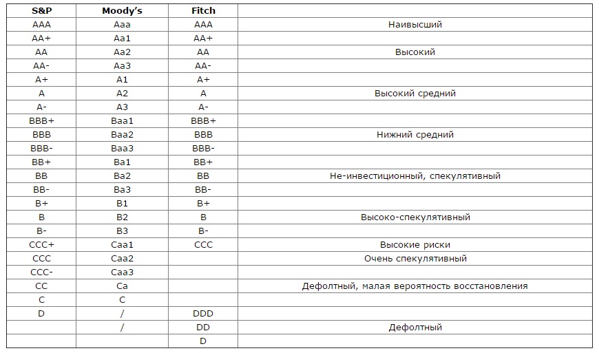 Рейтинги компаній і країн збігаються і ранжуються від найвищого до дефолтного. Компанії та країни і рейтингом нижче BBB- та/або Baa3, не рекомендуються для інвесторів. Україна в даному списку знаходиться на рівні СС-Са-С, тобто на середньому-нижньому рівні «Дефолтний, мала ймовірність відновлення». У 2015 році рейтинг країни був знижений, з коментарем: «високий рівень державного боргу з низькою перспективою погашення, низький темп впровадження реформ».