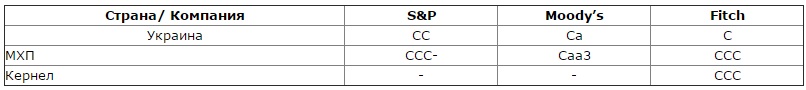 При цьому рейтинги провідних публічних аграрних холдингів країни на порядок вище. S&P і Moody's визначають компанії Кернел і МХП в ту ж категорію, що і Україна, «Дефолтний, мала ймовірність відновлення», хоч і з більш високою оцінкою (ССС-). Fitch ж упевнений в компаніях настільки, що помістив їх на категорію вище, в розряд компаній «з високим рівнем ризику». У той же час, необхідно відзначити, що агентство може знизити рейтинг під час наступного перегляду.