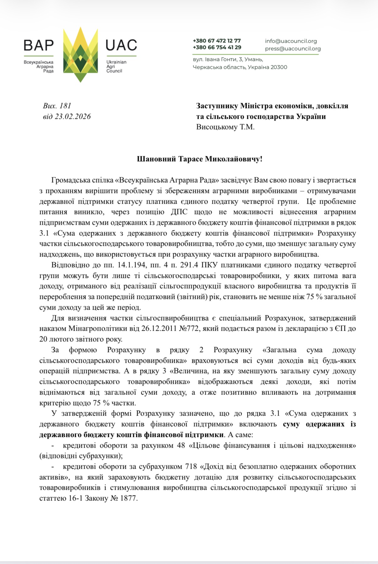 Всеукраїнська аграрна рада (ВАР) звернулася до заступника міністра економіки, довкілля та сільського господарства України Тараса Висоцького через проблему врахування аграріями державної фінансової підтримки при розрахунку частки сільгоспвиробництва. Це створює ризик недотримання 75% критерію та втрати аграрними підприємствами статусу платника єдиного податку четвертої групи.