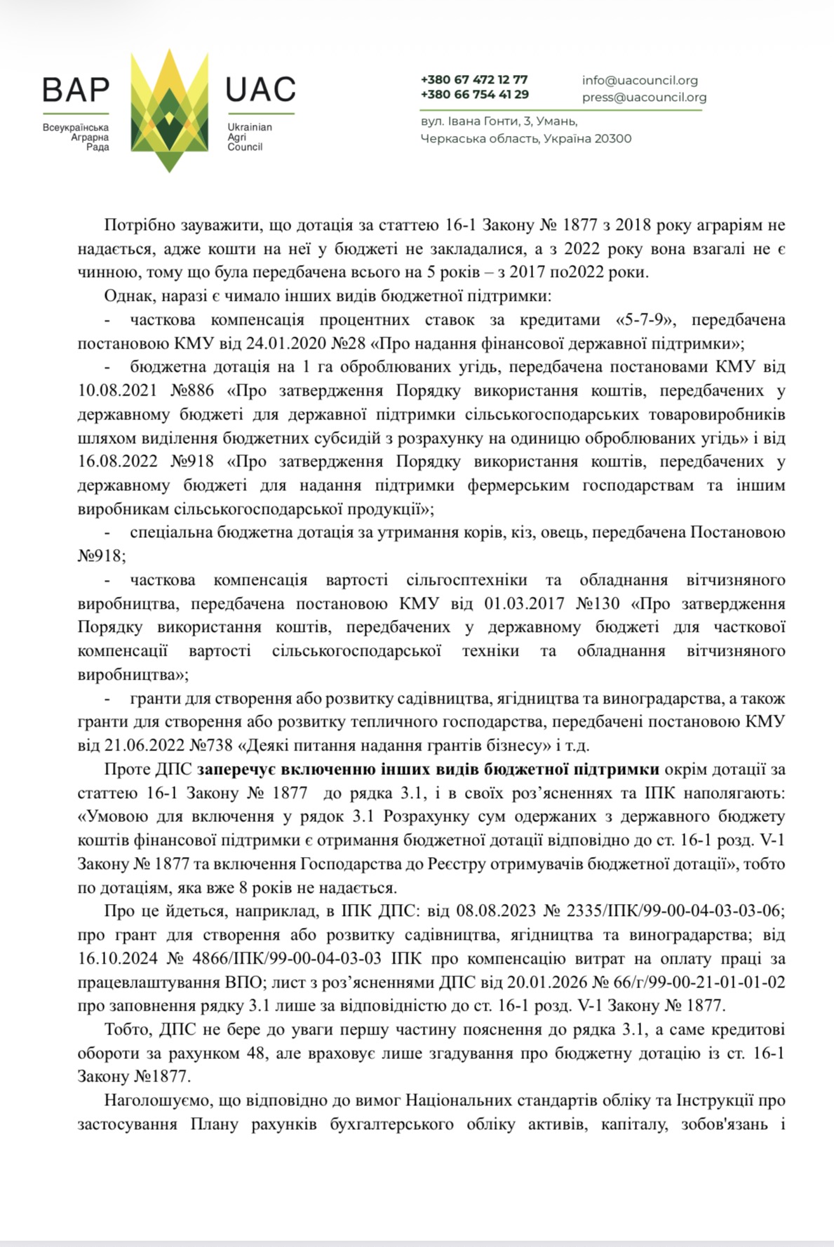 «ДПС заперечує включенню інших видів бюджетної підтримки окрім дотації за статтею 16-1 Закону № 1877 до рядка 3.1, і в своїх роз’ясненнях та ІПК наполягають: «Умовою для включення у рядок 3.1 Розрахунку сум одержаних з державного бюджету коштів фінансової підтримки є отримання бюджетної дотації відповідно до ст. 16-1 розд. V-1 Закону № 1877 та включення Господарства до Реєстру отримувачів бюджетної дотації», тобто по дотаціЇ, яка вже 8 років не надається ї», - зазначається у зверненні.