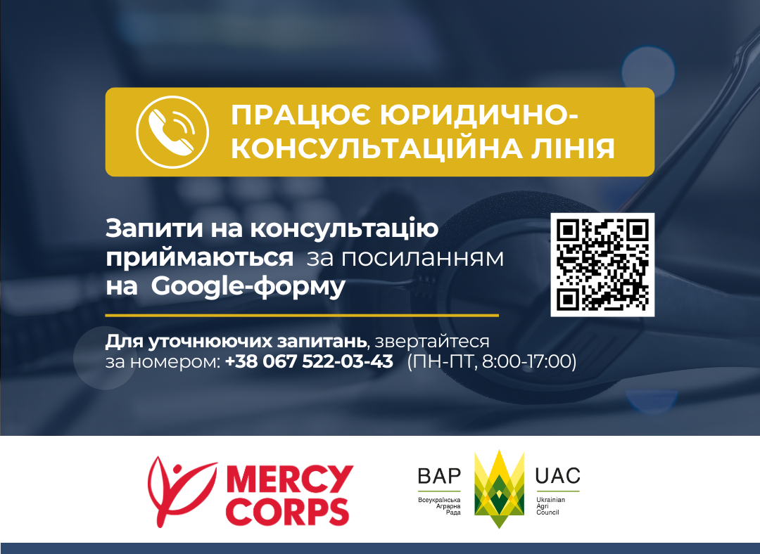Всеукраїнська аграрна рада (ВАР) відкрила юридично-консультаційну лінію для надання правових та бухгалтерських консультацій агровиробникам з постраждалих регіонів у партнерстві з міжнародною гуманітарною організацією MERCY CORPS.